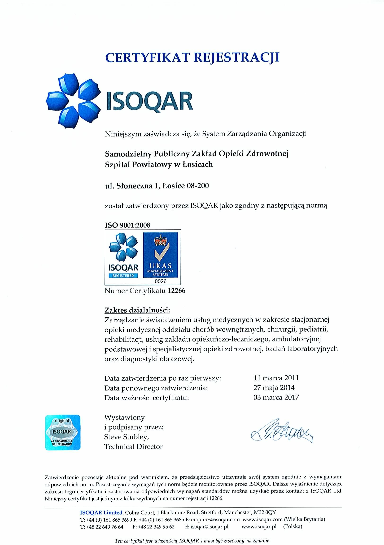 W dniach 3-4 marca bieżącego roku w Samodzielnym Publicznym Zakładzie Opieki Zdrowotnej w Łosicach został przeprowadzony audytu recertyfikacyjny, celem którego było potwierdzenie zgodności systemu zarządzania jakością z wymaganiami normy ISO 9001:2008, która już od ponad trzech lat funkcjonuje w naszej placówce.