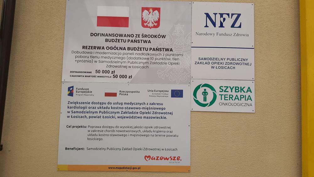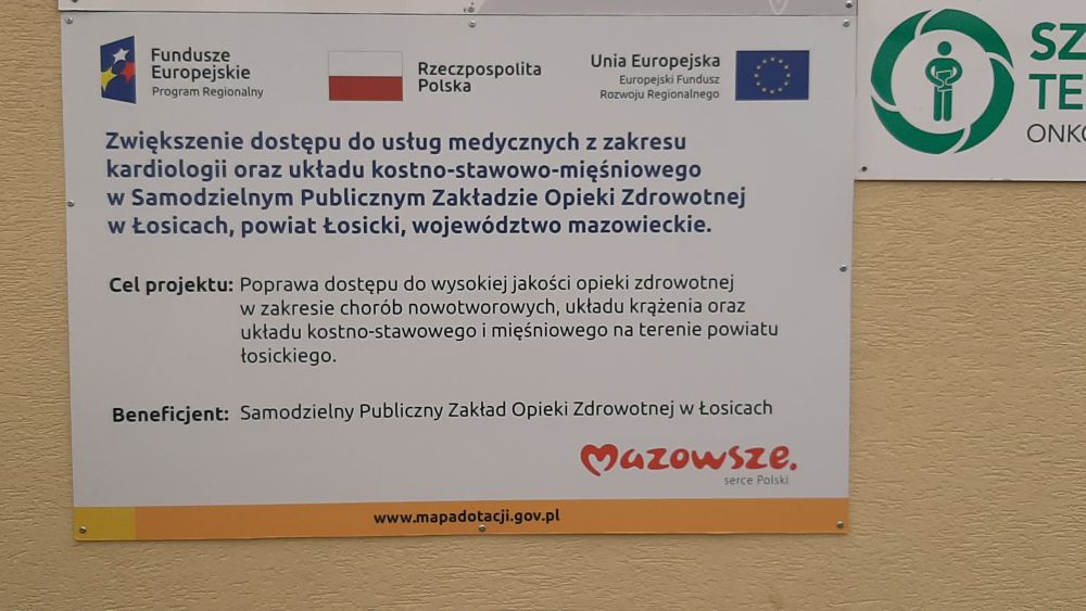 W ramach projektu .pt. ,, Zwiększenie dostępu do usług medycznych z zakresu kardiologii oraz układu kostno-stawowo-mięśniowego w Samodzielnym Publicznym Zakładzie Opieki Zdrowotnej w Łosicach, powiat Łosicki, województwo mazowieckie” współfinansowanego z Europejskiego Funduszu Rozwoju Regionalnego w ramach Osi Priorytetowej VI „Jakość życia” Działania 6.1. „Infrastruktura ochrony zdrowia” Regionalnego Programu Operacyjnego Województwa Mazowieckiego na lata 2014-2020 został zakupiony wysokospecjalistyczny tomograf komputerowy do pracowni tomografii komputerowej oraz holter do Podstawowej Opieki Zdrowotnej.